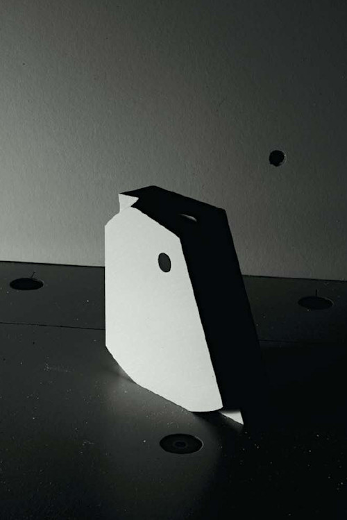 Christian Helmle: Die Beschränkung auf geometrische Grundformen und die Lichtführung erinnern an Arbeiten des russischen Konstruktivismus. Ihrer Funktion beraubt, werden die gefundenen Objekte zu Skulpturen. Dadurch entstehen kleine fiktive Architekturen, die Raumstationen ähneln. Wie in einer wissenschaftlichen Versuchsanordnung scheinen elementare Gesetze visualisiert.