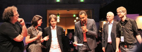 Die Jury on stage (v.l.n.r.): Urs Stahel, Direktor Fotomuseum Winterthur, Barbara Stauss, Gründungsmitglied und Bildchefin «mare – die Zeitschrift der Meere», Frank Bodin, CEO von EURO RSCG. Weiter auf dem Bild Bernard Senn Moderator und bekannt aus der SF-DRS Sendung «Sternstunde», Conrad Ammann, Direktor des ewz sowie der Hauptgewinner Meinrad Schade.
