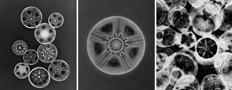 Beim Betrachten leerer PET-Flaschen scheint es schwer vorstellbar, dass daraus T-Shirts, Jacken oder sogar Cocktailkleider hergestellt werden. In der Modeindustrie setzt sich das aus rezykliertem PET gewonnene Garn immer mehr durch. Durch das Recycling der PET-Flaschen können Ressourcen eingespart und damit die Umwelt geschont werden. Das unscheinbare Material PET vollzieht dabei eine Transformation und zeigt sich in einem überraschend neuen Kleid. In diesem Sinne soll auch die Darstellung der PET-Flaschen für dieses Fotoprojekt erstaunen. Eher zufällig kam ich dabei auf die Idee, die Flaschen durch Fotogramme und die Verwendung von Spitzenstoffen in einen modischen Zusammenhang zu stellen. Das Fotogramm ist eine Technik, bei der ein Gegenstand auf ein Schwarz-Weiss-Fotopapier gelegt und anschliessend belichtet wird. Auf diese Weise entstehen einzigartige Bilder. Doch bei der Verwendung dieser eher alten Technik wollte ich es nicht belassen. Ich habe sie deshalb mit der Digitalfotografie verbunden. Und so wurden die Spitzenstoffe erst nach der Entstehung der Fotogramme digital ins Bild eingefügt. Alte und neue Techniken werden verbunden, während die PET-Flaschen auf den Fotogrammen eine neue Form und mit den Spitzenstoffen ein neues Kleid bekommen.