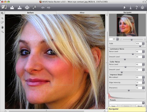 Die Schnittstelle der Entrauschungssoftware bietet die Möglichkeit zwischen dem Originalbild und dem Ergebnis mit einem Mausklick umzuschalten. Die einzelnen Einstellungsfelder für Helligkeits- und Farbrauschen erlauben es eine Bildstörung effektiv zu beseitigen.