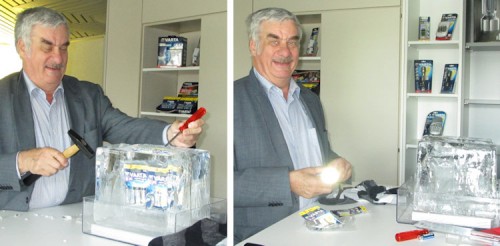Der erbarmungslose Kältetest: Die neuen Varta Lithium-Batterien waren tagelang in einem Eisblock festgefroren. Fotointern-Redaktor Urs Tillmanns befreit die Batterien aus der frostigen Umgebung, setzt diese in eine LED-Leuchte ein und – siehe da – sie brennt!