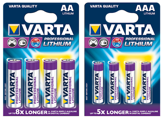 Varta erweitert das Professional Lithium Sortiment mit den 1,5-Volt Batterien in den Grössen AA und AAA. Das wirkt sich vor allem auf das Gewicht und die längere Einsatzfähigkeit in Digitalkameras und Blitzgeräten aus. Die Batterien sollen fünf- bis achtmal länger halten als Alkaline-Batterien.