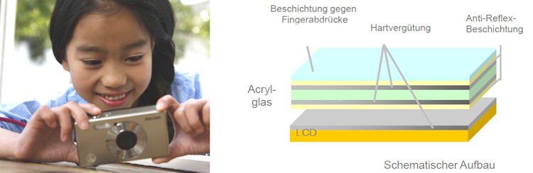 Das Display ist mit mehreren Schutzschichten extrem widerstandsfähig. Zwei Antireflex-Schichten verbessern den Sehkonfort auch bei heller Umgebung
