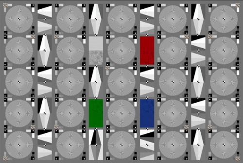 * Vier Dead Leaf Muster (grau, rot, grün, blau) mit Referenzfläche befinden sich in der Nähe der Bildmitte.
