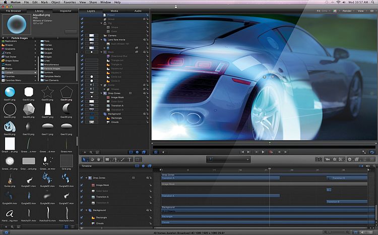 Final Cut Pro X verfügt ausserdem über leistungsstarke Werkzeuge zur Audiobearbeitung und Farbkorrektur und wird von zwei passenden Apps ergänzt. Motion 5 für professionelle Grafikanimation sowie Compressor 4 für leistungsstarkes Codieren.