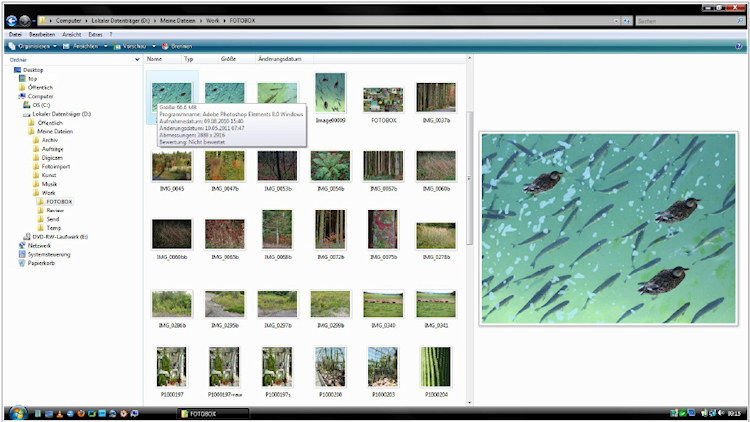Ich selber bevorzuge allerdings das Verwalten nach traditioneller Art. Die Ordner- und Dateinamenverwaltung hat nämlich den Vorteil, dass sie Plattform und Programm unabhängig funktioniert. Hier eine kurze Beschreibung meines derzeitigen Systems: Ich arbeite mit Windows Computern. Damit der Windows Explorer auch meine Photoshop-Dateien als Bild anzeigen kann, habe ich das kleine aber sehr nützliche Programm PSDcodec installiert. Auf der zweiten Partition meiner Festplatte, also zum Beispiel Laufwerk (D) befinden sich alle meine «Eigenen Dateien». Im Laufe der Jahre habe ich eine sinnvolle Ordnerstruktur erarbeitet. Diese erlaubt es mir, einzelne Dateien schnell und ohne zu suchen zu finden. Für die archivierten Dateien schreibe ich Dateinamen, die aus mehreren Abkürzungen von Stichwörtern bestehen. Ein Dateiname kann also wie folgt aussehen: «fac.pla.flo.gre.2011.04.22.14.52.00.jpg». «fac» steht für face, «pla» steht für plant. Die englische Sprache verträgt sich besser mit dem Computer als die deutsche Sprache mit ihren Umlauten. Dateinamenregeln finden Sie auf wiki/dateinamen. Wenn ich nun einmal alle meine Fotos zum Thema Pflanzen in einem Bildfenster betrachten möchte, gebe ich in der Windows Explorer Suche das Stichwort «pla» ein und schon habe ich meinen Bildschirm voller Pflanzenbilder.
