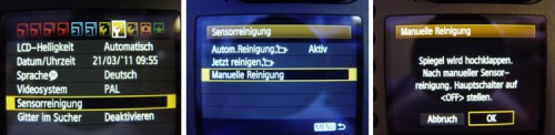 Das Reinigungsprgramm (Spiegel hochklappen und Verschluss öffnen) benötigt minutenlang viel Strom. Bedienungsanleitung der Kamera beachten!