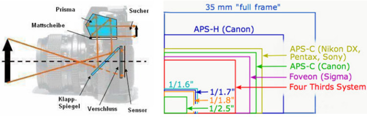 Der Sensor ist vom Spiegel und dem Verschluss verdeckt. Hier die verschiedenen Sensorgrössen im Vergleich