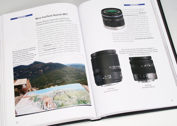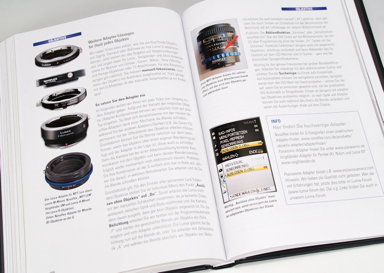 Eine Besonderheit ist das Kapitel «Objektive». Hier handelt Späth alle an den Lumix-Modellen verwendbaren Objektive ab, nicht nur diejenigen von Panasonic, sondern auch solche von Leica, Olympus, Voigtländer (Nokton 1:0,95/25mm!), Sigma, bis hin zu Walinex und Lensbaby. Klar, dass hier auch das Thema «Adapter» zur Sprache kommt, mit der Frage, wie sinnvoll es sei, ältere Canon-, Contax-, Nikon-, Sony-/Minolta- oder Pentax-Objektive an den neuesten Lumix-Modellen zu verwenden. Gerade dieses Objektivkapitel wertet das Buch auch für bisherige Lumix-Besitzer auf, die sich einen umfassenden Überblick über die an Lumix-Kameras verwendbaren Objektive verschaffen möchten. Dieser ist eigentlich alleine schon den Preis des Buches wert.