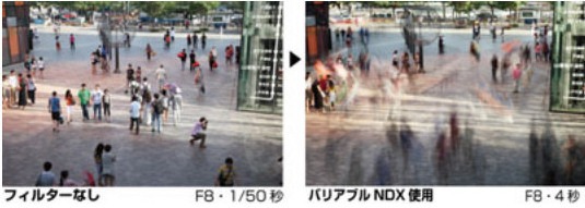 Der Kenko-Tokina NDX (variable neutrale Dichte) besteht im Prinzip aus zwei Polarisationsfiltern, welche durch Drehen am vorderen Fassungsring stärker gekreuzt werden und so einen höheren Verlängerungsfaktor bewirken. Dieser bewegt sich zwischen ND2,5 bis ND1000, was 1,3 bis 10 Belichtungsstufen entspricht.