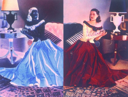 Darstellung des Agfacolor Negativ/Positiv-Verfahrens (um 1942). Mit solchen Gegenüberstellungen eines Farbnegativs (links) mit dem entsprechenden Positivbild (rechts) wurde in den 1940er Jahren die Funktionsweise des noch in der Erprobung befindlichen Agfacolor-Negativ/Positiv-Verfahrens für Farbbilder demonstriert. (Sammlung Koshofer)