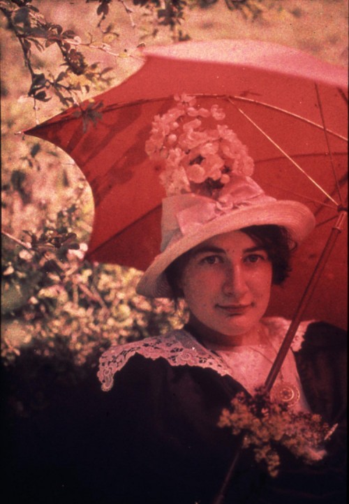 Autochome «Frau mit rotem Schirm» (Autochrome von Karel Smirous, 1912) Der tschechische Photograph Karel Smirous nahm 1912 seine Jugendliebe auf der Autochrome-Platte auf. Ein roter Schirm diente oft als Staffage in der frühen Farbphotographie. (Duplikat Sammlung Koshofer)