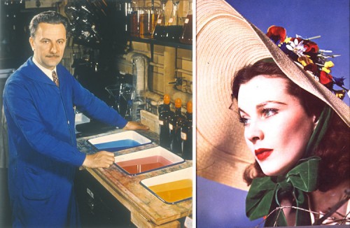 Der Erfinder des Kodak Dye Transfer Verfahrens Louis Condax ist hier um 1940 in seinem Photolabor mit den drei Farbstoffen Cyan, Magenta und Yellow zu sehen, die bei der Herstellung von Farbbildern nach dem 1947 von Kodak eingeführten Dye-Transfer-Verfahren (Farbstoff-Übertragung) Verwendet wurden. (Sammlung Phil Condax, Rochester, N. Y., USA). Rechts die Schauspielerin Vivien Leigh deren Dye-Transfer-Bild von Louis Condax um 1947 hergestellt wurde. Das international bekannteste und noch vor wenigen Jahren ausgeübte Spezialverfahren zur Herstellung von Farbbildern war Dye Transfer von Kodak. Sein Name besagt, dass hierbei Farbstoffe bildmäßig auf eine Unterlage übertragen wurden. Der amerikanische Erfinder Louis Condax machte selbst diese Aufnahme der Filmschauspielerin Vivien Leigh 1939 am Set des Films „Vom Winde verweht“ und stellte später davon das Dye-Transfer-Bild her. (Sammlung Phil Condax, Rochester, N. Y., ISA)