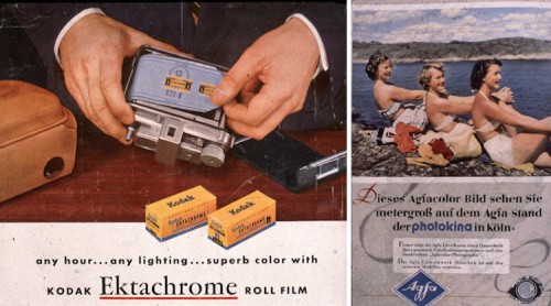 1946 Als zweite Filmgeneration für Farbdiapositive bringt Kodak den Ektachrome heraus. Auf seinem chemischen Grundprinzip beruhen alle heutigen Farbfilme (ausgenommen Sofortbildfilme). Rechts: 1951 Auf der ersten «photokina» in Köln steht die Farbphotographie im Blickpunkt. Agfa Leverkusen zeigt eine Sonderschau «Agfacolor-Photographie».