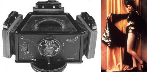 Jos-Pe Dreifarbenkamera Typ Uka (um 1926). Mit solchen Spezialkameras wie der von 1924 bis 1934 in drei Ausführungen hergestellten „Jos-Pe-Kamera“ (benannt nach den Vornamen des Finanziers Josef-Peter Welker, Hamburg) wurden gleichzeitig die drei für Farbbilder benötigten Aufnahmen gemacht. Dazu befand sich hinter dem Objektiv ein optisches Strahlenteilerelement, welches das Bild auf die mit roten, grünen und blauen Filtern verbundenen schwarz/weissen Photoplatten ablenkte. Rechts: „Tänzerin“ (Jos-Pe Dreifarbenbild, um 1930) Zur „Jos-Pe-Kamera“ gehörte ein Verfahren zur Anfertigung von Farbbildern, das 1923-1931 sowie 1934-1943 von dem gleichnamigen Unternehmen in Hamburg für Berufs- und Amateurphotographen ausgeübt wurde. Die Bombardierung Hamburgs führte zum Ende des Labors. Das „Jos-Pe“-Farbbild der Tänzerin entstand um 1930 und befand sich im Kodak Museum, Harrow (England).