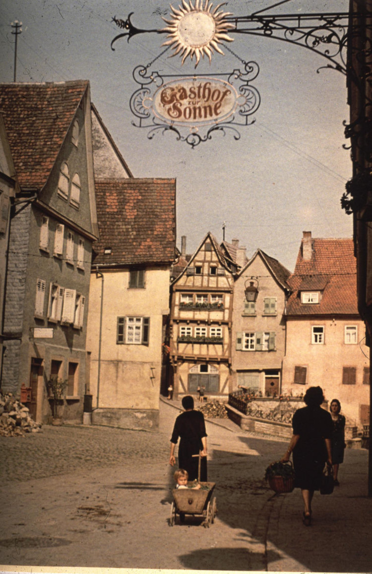 «Kleinstadt in Süddeutschland» (Agfacolor-Negativ/Positiv-Verfahren) Diese Vergrösserung auf dem damals noch in der Erprobung befindlichen Agfacolor-Farbphotopapier wurde 1944 angefertigt. Sie zeigt eine süddeutsche Kleinstadt im Kriege, ohne Autos und Antennen, aber auch ohne Männer. (Sammlung Agfa Historma)