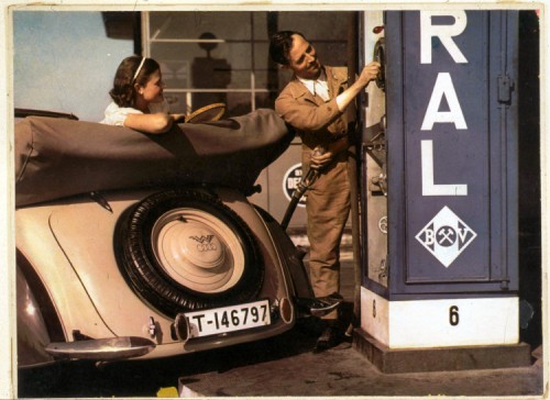 «Aral Tankstelle» (Duxochrom-Bild von Hermann Harz, um 1936) Der in den 1939er und 1949er Jahren bekannte deutsche Farbfotograf Hermann Harz machte um 1936 diese Werbeaufnahme für Aral-Benzin mit der Bermpohl „Naturfarbenkamera“ und stellte davon eine Vergrösserung nach dem Duxochrom-Verfahren der Firma Herzog, Bremen, her. (Sammlung Fotomuseum im Stadtmuseum München)