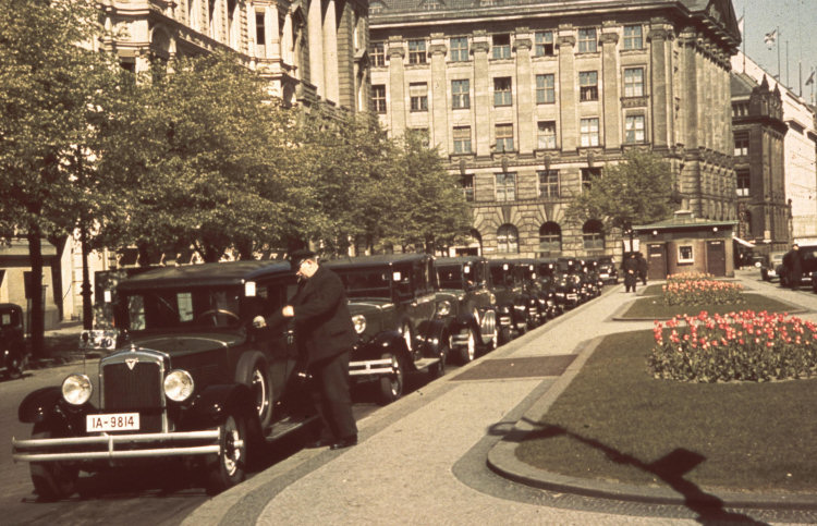 „Taxen vor dem Hotel Kaiserhof in Berlin“ (Agfacolor-Dia, um 1938) Der Mitarbeiter der Firma Zeiss Ikon, Dresden, Wolfgang Jacobi, nahm um 1938 wartende Taxen vor dem Hotel Kaiserhof in Berlin auf Agfacolor Diafilm auf. (Sammlung Koshofer)