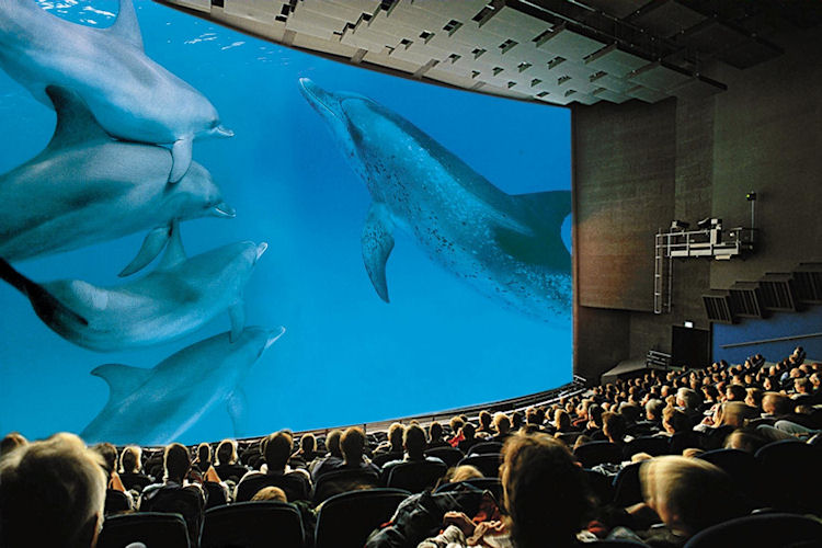 An die Grösse dieser Leinwand mit fast 500 Quadratmeter Fläche und einer Breite von 25 Metern haben sich die häufigen Besucher des Filmtheaters im Verkehrshaus längst gewöhnt. Verblüffend ist jedoch die Bildwirkung jedesmal aufs Neue, besonders bei 3D-Filmen. Die Raumwirkung des Films bekommt hier eine ganz neue Dimension, die den populären Raumeffekt der neuesten Fernsehgeneration mit Shutterbrillen um ein Vielfaches übertrifft. Beim Filmtheater im Verkehrshaus trägt die gigantische Projektionswand zum Filmerlebnis bei, vor der die Zuschauer – wie die Werbung sagt – «mitten im Geschehen» drin ist. Und mitten drin sind übrigens auch die besten Plätze, weil man hier die volle Bildgrösse noch eindrucksvoller mitbekommt.