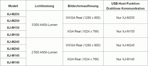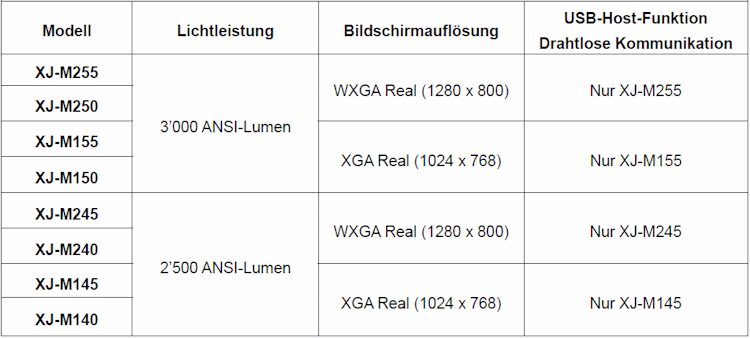 Zahlreiche unterschiedliche Anschlussmöglichkeiten. Alle neuen Modelle verfügen über einen RGB-Eingang, einen Videoeingang, HDMI und über RS-232C-Anschlüsse. Die für drahtlose Kommunikation ausgelegten Modelle haben zudem einen Anschluss für ein LAN-Kabel. (XJ-M255, XJ-M245, XJ-M155 und XJ-M145)