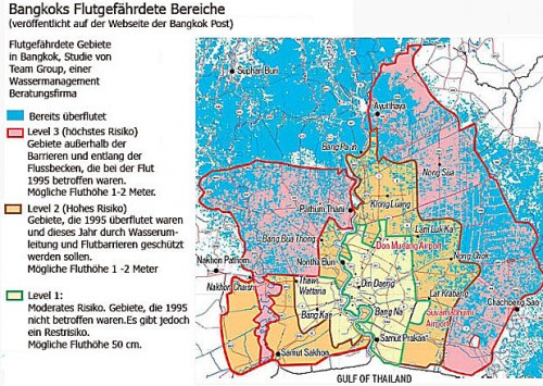 Die Flutkatastrophe nahm bereits am 4. Oktober 2011 ihren Lauf, als der Chao Phraya Fluss bei Wat Chaiwattanaram barst und die historische Hauptstadt Ayutthaya und die tiefergelegenen Industriegebiete Saha Rattana Nakorn, Rojana und Hi-Tech überflutete. Jetzt ist auch eine vierte Industrieanlage, Bang Pa-in, überschwemmt worden, wie gestern die Bangkok Post meldete. Dort sollen in 90 Firmen rund 60‘000 Arbeitende beschäftigt sein.