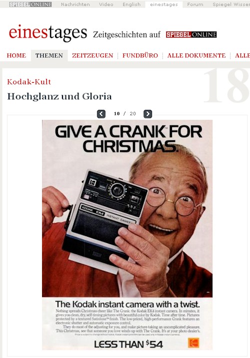 In der Spiegel-online Rubrik «eines Tages» werden die Ursachen für den seit Jahren rückläufigen Geschäftsgang von Kodak analysiert, von der Patentklage von Polaroid – die es inzwischen in der einstigen Form auch nicht mehr gibt – über die «schimmelnden Scheiben» bis hin zur verpassten Digitalchance.