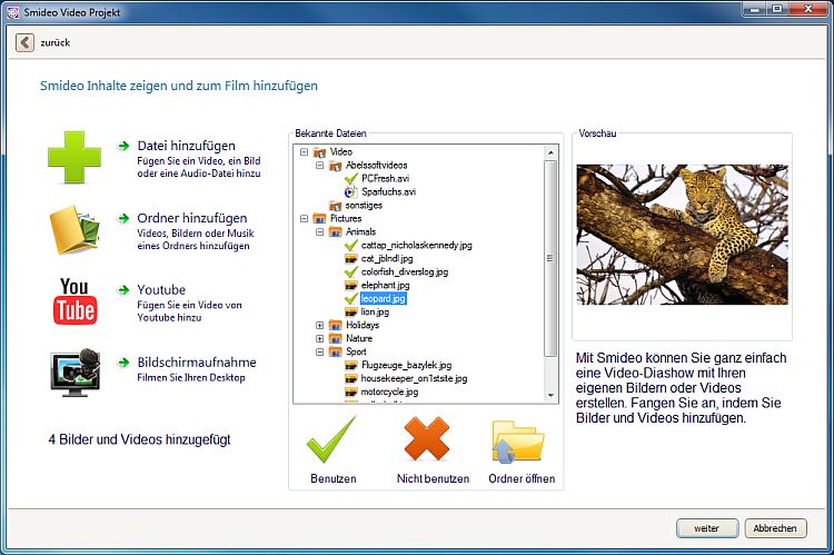 Mit Smideo HD lassen sich einzelne Fotos oder ganze Bilderordner sowie Videos dem Projekt hinzufügen, um daraus einen Diaschau-Videofilm herzustellen.