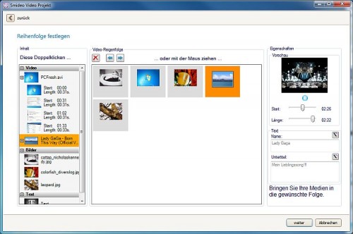 In Smideo lassen sich die Reihenfolge und die Darstellungsdauer von Bilder samt einem allfälligen Text festlegen.