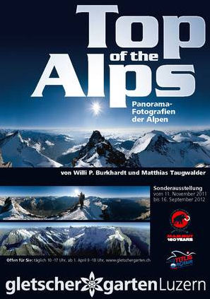 Im Gletschergarten Luzern wird die neue Sonderausstellung «Top of the Alps» eröffnet, welche bis 15. September 2012 grossformatige 360°-Fotopanoramen aus den Alpen zeigt. Diese begehbaren Gigapixel-Bilder stammen vom jungen Bergsteiger Matthias Taugwalder aus Zermatt, der sich als Fotograf und Informatiker der digitalen Inventarisierung der Alpen verschrieben hat. Ergänzend dazu sind Panorama-Fotografien aus der Luft zu sehen, die Willi P. Burkhardt geschaffen hat. Er gilt als Pionier der Helikopterfotografie und hat in den vergangenen 50 Jahren mehr als 50’000 Grossbildaufnahmen erstellt.