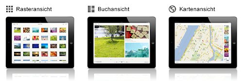 Die Rasteransicht ist ideal für das Einordnen Ihrer Fotos in ein Album. In der Buchansicht werden Ihre Fotos automatisch in einem virtuellen Fotobuch angeordnet. Und in der Kartenansicht sehen Sie, wo die Fotos aufgenommen wurden. Alle drei Ansichten zeichnen sich durch eine effektivere Präsentation Ihrer Fotos aus.