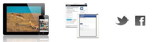 my Picturetown Pad unterstützt die integrierte Kamera Ihres iPad 2 oder iPhone. Die Kamera können Sie sogar von der App aus starten. So können Sie mit Ihrem iPad bzw. iPhone aufgenommene Fotos auf einfache Weise per E-Mail für Personen in Ihrem Adressbuch freigeben. Senden Sie einfach ein Foto zusammen mit einem Kommentar zu Ihrem Facebook-Konto oder senden Sie ein Foto-Tweet über Ihr Twitter-Konto. Durch die sofortige Freigabe von Fotos auf Facebook oder Twitter können Sie Ihre Kommunikation erheblich verbessern.