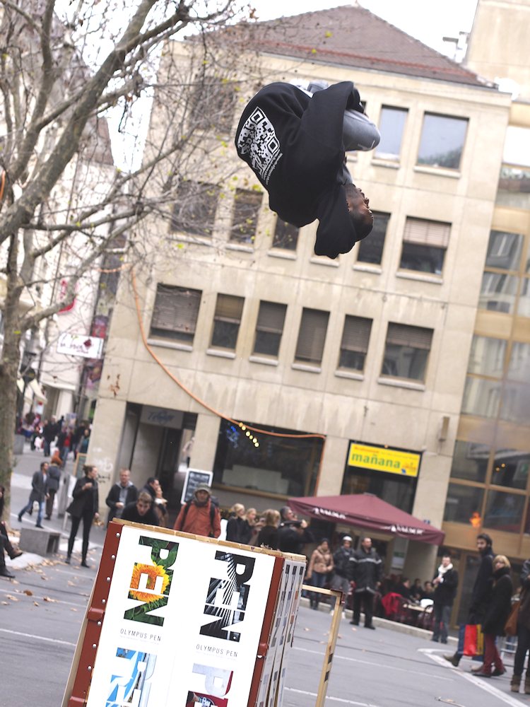 Olympus Schweiz und Foto Zumstein präsentieren diesen Samstag (10. 12. 2011) eine Auswahl der besten Parkour-Sportler Europas. Ihre hohen Sprünge und waghalsige Salti können mit Leihkameras von Olympus fotografiert werden. Mitmachen lohnt sich: Unter allen Kameratestern wird nach der Veranstaltung eine Olympus PEN E-PM1 verlost.