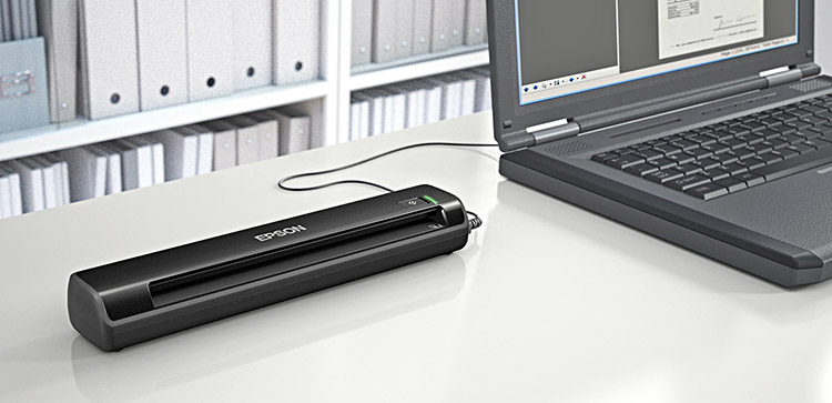 Mit dem mobilen, kompakten Einzug-/Durchzugscanner von Epson und einem Notebook lassen sich Dokumente bis DIN A4 einfach und schnell vor Ort digitalisieren.