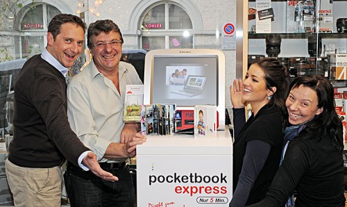 Mitte Dezember wurde das erste Pocketbook Express der Schweiz bei Foto Breitenmoser in Rüti ZH installiert (v.l.n.r. Edi Wismer von GraphicArt AG sowie Rolf Breitenmoser, Monika Ehrbar und Sarah Honegger von Foto Breitenmoser)