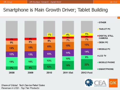 In der Grafik soll vor allem die Entwicklung der Smartphones aufgezeigt werden, doch ist sie auch für die anderen Produktebereiche interessant; Digitalkameras sollen laut GfK auch für 2012 mit 4% weiterhin konstant bleiben. Dabei soll sich vor allem der Bereich der Systemkameras und der hochpreisigen DSLRs positiv entwickeln, während die Kompaktmodell zunehmend durch die immer besser werdenden Smartphones Konkurrenz bekommen.
