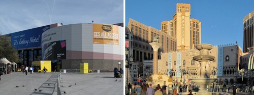 Die beiden Veranstaltungsorte: Links das Convention Center mit der CES, rechts das Casinohotel Venetian, wo die PMA in einem Ballsaal untergebracht ist.