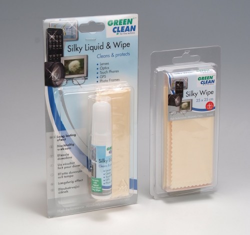 «Silky Liquide & Silky Wipe» sind Optikreiniger mit einem schmutzabweisenden Effekt. Zur Vorreinigung dient der Spray «Silky Liquide», der Schmutz und Fettspuren löst, die danach einfach und wirkungsvoll mit dem «Silky Wipe» beim Nachpolieren entfernt werden. Selbst viel beanspruchte Geräte wie beispielsweise Mobiltelefone oder Tablet-Computer bleiben dank des schmutzabweisenden Effekts nachhaltig sauber, Fettspuren lassen sich einfach und problemlos wegwischen.