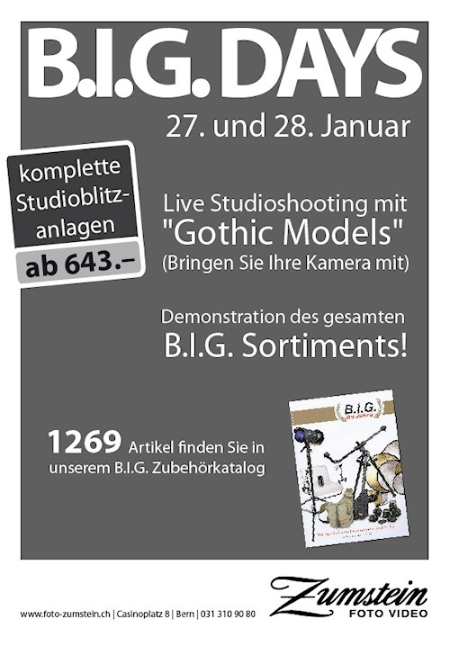 Am Freitag und Samstag, 27. und 28. Januar 2012 ist bei Foto Zumstein in Bern ganz schön was los: An den beiden «B.I.G. Days» wird das gesamte Sortiment des deutschen Zubehörlieferanten B.I.G. demonstriert. Ein fast uferloses Angebot von nützlichen Hilfsmitteln für den Aufnahmebereich, aber auch fürs Studio oder für die Nachbearbeitung.