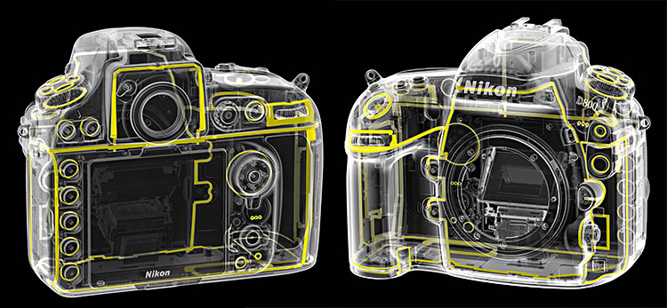 Nikon D800 mit Darstellung der Dichtungsstellen.