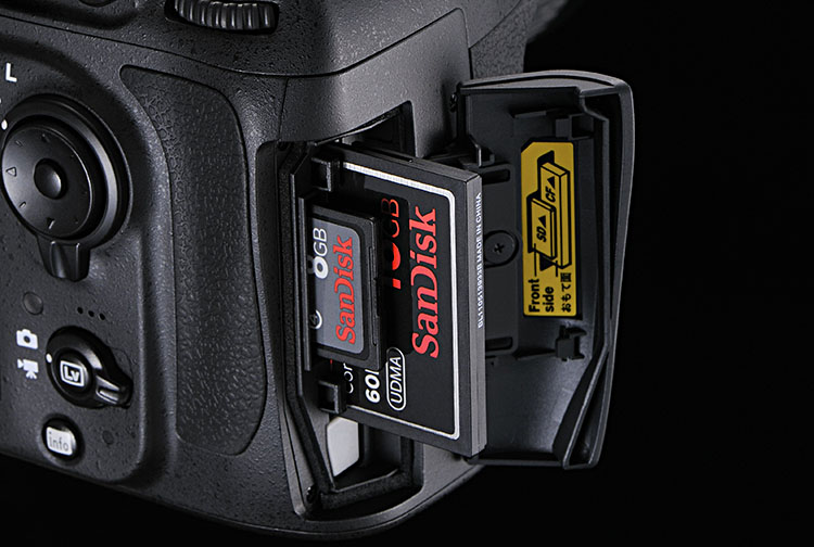 Die Nikon D800 verfügt über einen DualSlot, der gleichzeitig eine CF und eine SD-Speicherkarte aufnimmt. Wie bei früheren Nikon-Modellen lassen sich beide Karten nacheinander (Überlauf) oder gleichzeitig nutzen: simultane Speicherung auf beide (Datenspiegelung), Speicherung von RAW-Fotos auf eine und JPEG-Fotos auf die andere, Fotos auf eine und Videos auf die andere.
