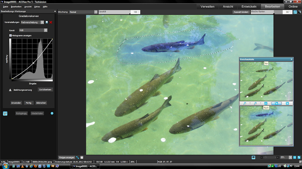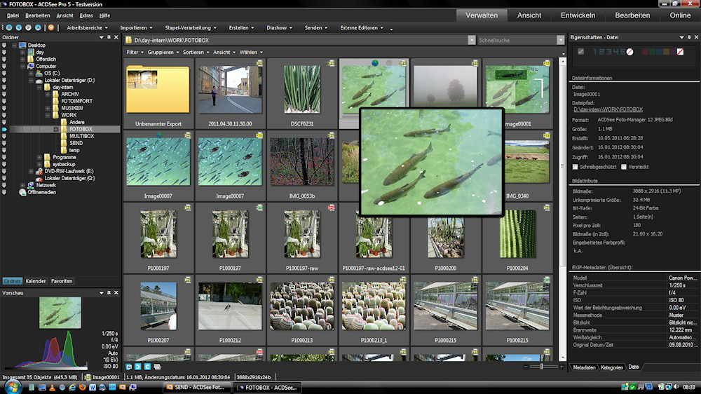 Wer es gewohnt ist, die eigenen Dateien nach traditionellem System in den Ordnern zu verwalten, und auch in Zukunft dabei bleiben möchte, der ist bei ACDSee genau richtig. Das Programm arbeitet wie ein Windows Explorer oder der Finder im Mac. Dateien lassen sich verschieben, kopieren und löschen. ACDSee zeigt nicht nur Bilddateien an, auch alle andern Dateiformate wie Word, PDF oder Videos werden aufgelistet. Damit ist diese Applikation ein universeller Daten-Verwalter. ACDSee hatte keine Mühe mit den diversen Dateiformaten der Fotos. RAW, DNG, PSD, TIFF, JPEG usw. wurden nicht nur korrekt angezeigt, sie liessen sich auch entwickeln und verarbeiten. Das Programm kann die überarbeiteten Fotos so speichern, dass bei Bedarf das Original Bild wieder hergestellt werden kann. In ACDSee Pro5 stehen alle notwendigen Werkzeuge für die RAW-Entwicklung zur Verfügung. Dazu kommen noch Bildbearbeitungswerkzeuge und Module für das Kennzeichnen und Bewerten der Aufnahmen. GPS-Daten werden ebenfalls unterstützt. Nicht ganz nachvollziehen kann ich Aufteilung der Bildbearbeitung in zwei Module. So muss ich vor jeder Bearbeitung einer Aufnahme überlegen, ob ich nun mit meinem Bild ins Entwickeln- oder ins Bearbeiten- Modul wechseln muss.