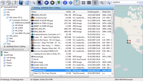 Danach kann über den Katalog der Inhalt jedes erfassten Datenträgers – wie im Mac OS Finder oder im Windows Explorer – angeschaut und durchsucht werden, und zwar ohne dass der Datenträger online ist, d.h. die betreffende CD/DVD/BD eingelegt oder die Festplatte angeschlossen ist.