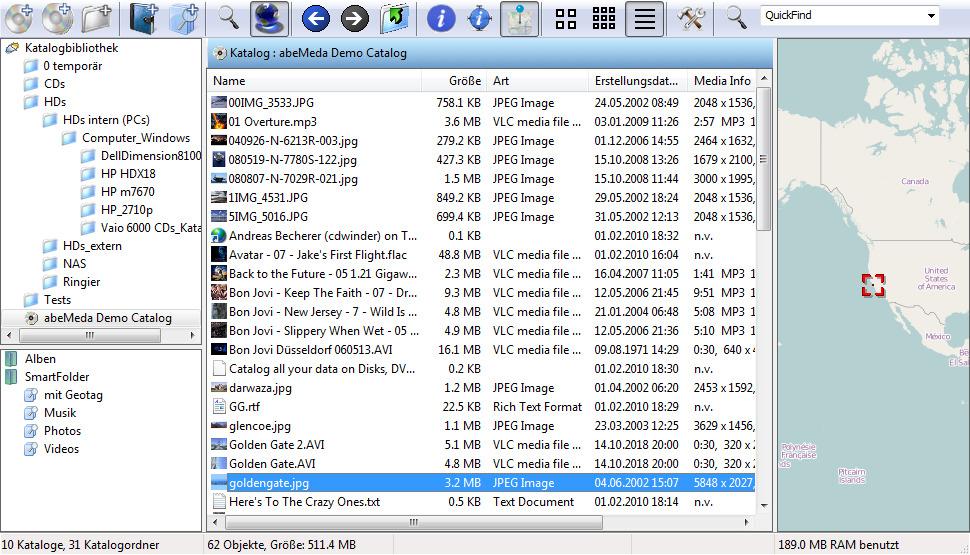 Hauptfenster von abeMeda 6. Links sind Ordner mit Katalogen zu sehen. Im mittleren Bereich wird die Dateiliste des aktuell ausgewählten Katalogs «abeMeda Demo Catalog» angezeigt. Ganz rechts auf der eingeblendeten Karte ist der Aufnahmeort des angeklickten Fotos markiert.