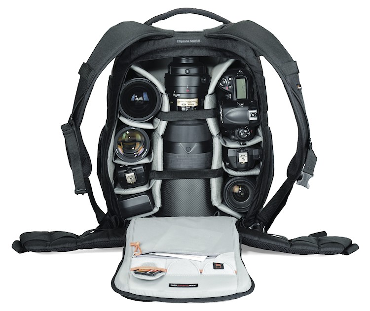 Lowepro hat den Flipside 500 AW für Profi-Fotografen entwickelt, die speziell im Bereich Sport- und Outdoor-Fotografie umfangreiches Foto-Equipment zuverlässig und sicher transportieren möchten. In das individuell anpassbare Kamerafach passen eine Profi DSLR mit angesetztem 500mm Objektiv, ein zusätzlicher Kamerabody, drei zusätzliche Objektive, zwei Blitzgeräte und Zubehör.