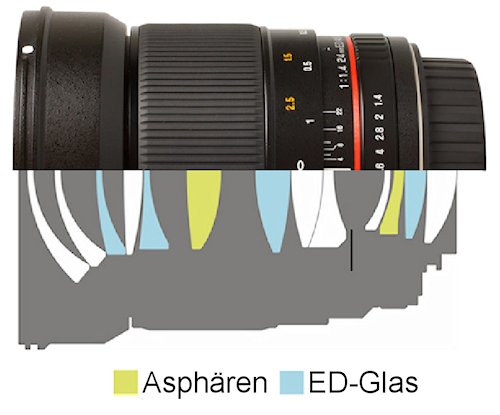 Das Samyang 1:1.4/24mm ED AS IF UMC besteht aus 12 Gruppen mit 13 Linsen. Vier davon bestehen aus speziellem ED-Glas, welches mit einem  extrem niedrigen Farbzerstreuungs-Index die chromatische Aberration besonders wirksam korrigiert. Zwei weitere Linsen haben eine asphärische Form mit besonderen Korrektionen, die eine sehr kompakte Bauweise des Objketivs ergeben. Weiter wird die Lichtqualität durch eine besondere Antireflex-Vergütung verbessert.