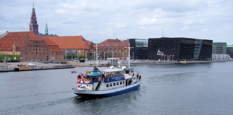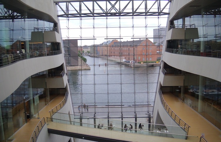 Blick auf das historische Gebäude der Dänischen Königlichen Bibliothek in Kopenhagen (Bildmitte) mit imposanten modernen Anbau