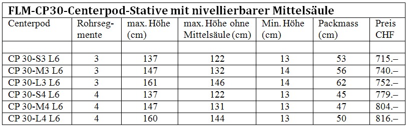 Die Centerpod-Baureihe CP30 L6 umfasst inzwischen sechs unterschiedliche Modelle, die sich hinsichtlich der Anzahl der Beinsegmente, dem Packmass und der nutzbaren Höhe unterscheiden. Allen gemeinsam sind der grösste Rohrdurchmesser von 30 mm, das Gewicht von 1,7 kg, die Tragkraft von 8 kg, die schnelle Beinfixierung über Schraubklemmen und die extrem einfache und schnelle Umstellung der Stativfüsse von Edelstahl-Spikes auf Parkett-schonende Gummifüsse.