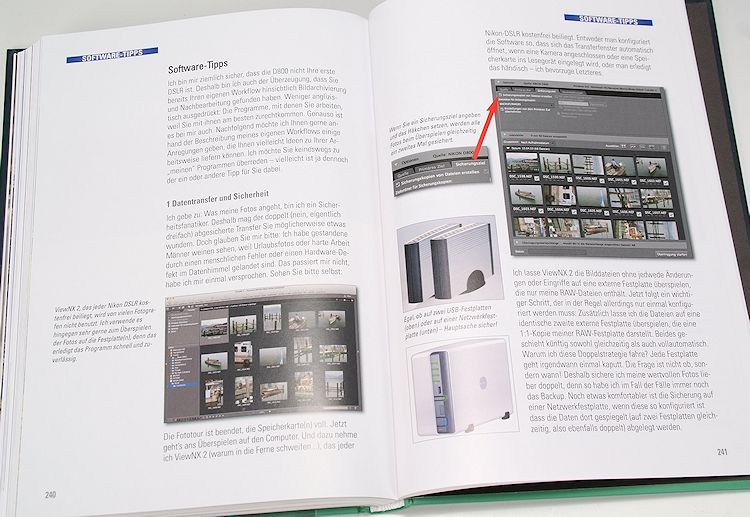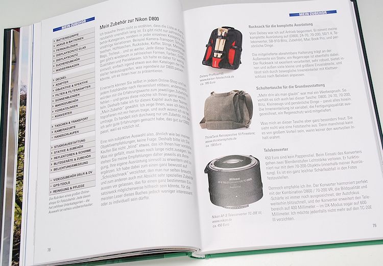 In beiden Büchern interessant, sind die persönlichen Ausrüstungs- und Zubehörempfehlungen der beiden Autoren. Hessler handelt dieses Thema schon relativ früh (ab Seite 78) in seinem Buch ab, während sich Gradias diesen individuellen Teil für das letzte Fünftel aufhebt. Danach folgt bei Gradias auch eine ausführliche Abhandlung über 53 Seiten der Nikon-Software ViewNX 2 sowie über die optionale Kamerasteuerungs-Software Control Pro 2 und Capture NX 2 zur D800/800E, während es Hessler bei zehn Seiten Software-Tipps bewenden lässt.
