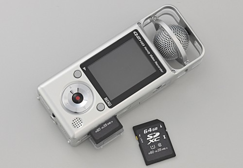 Für längere Aufzeichnungen lassen sich Videos sowohl in 720p als auch in Standardauflösung aufnehmen. Die mitgelieferte SD-Karte mit 2 GB bietet Platz für rund 40 Minuten in Full-HD-Qualität, im AAC-Format reicht eine 64-GB-SDXC-Karte für bis zu 15 Stunden Full-HD-Videos.