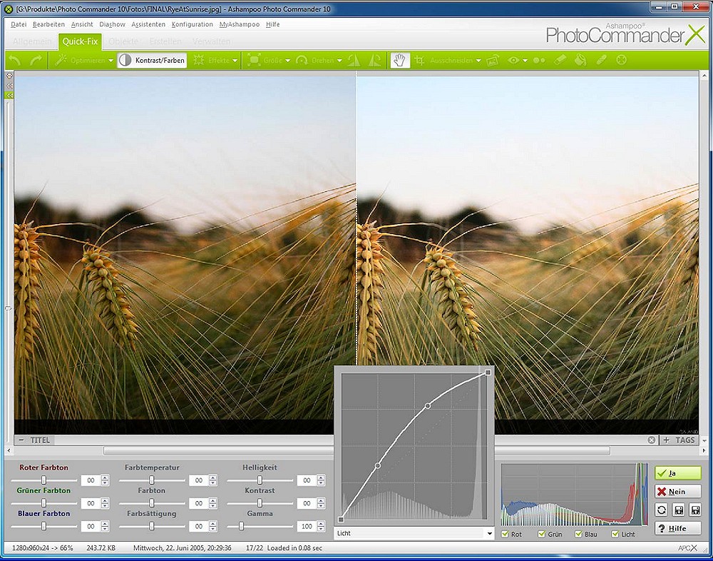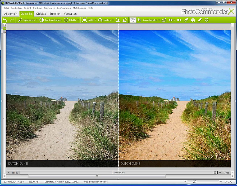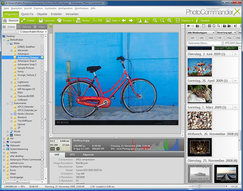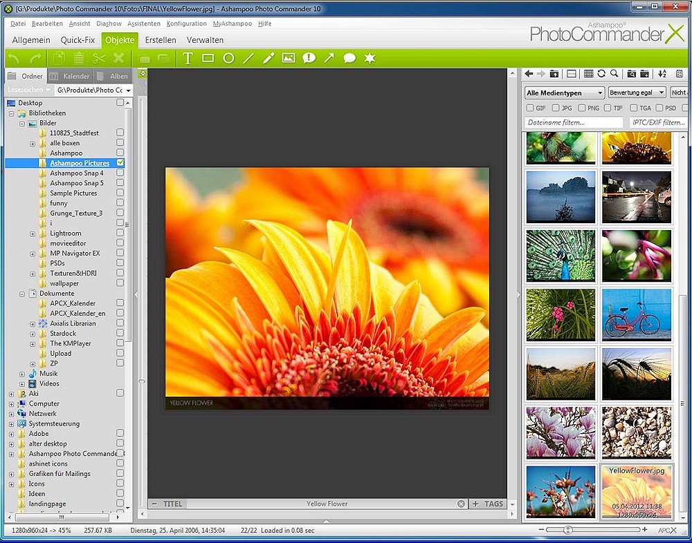 Die Version 10.1.2 des Ashampoo Photo Commander 10 Bearbeitungsprogramms ist mit vielen neuen Funktionen für die Verwaltung, Optimierung und Bearbeitung von Fotos erschienen. Die Bilder lassen sich einfach von der am PC angeschlossenen Kamera auf die Festplatte übertragen. Mit der bedienerfreundlichen Oberfläche wird die Verwaltung und Bearbeitung von Fotos und Videos deutlich vereinfacht.